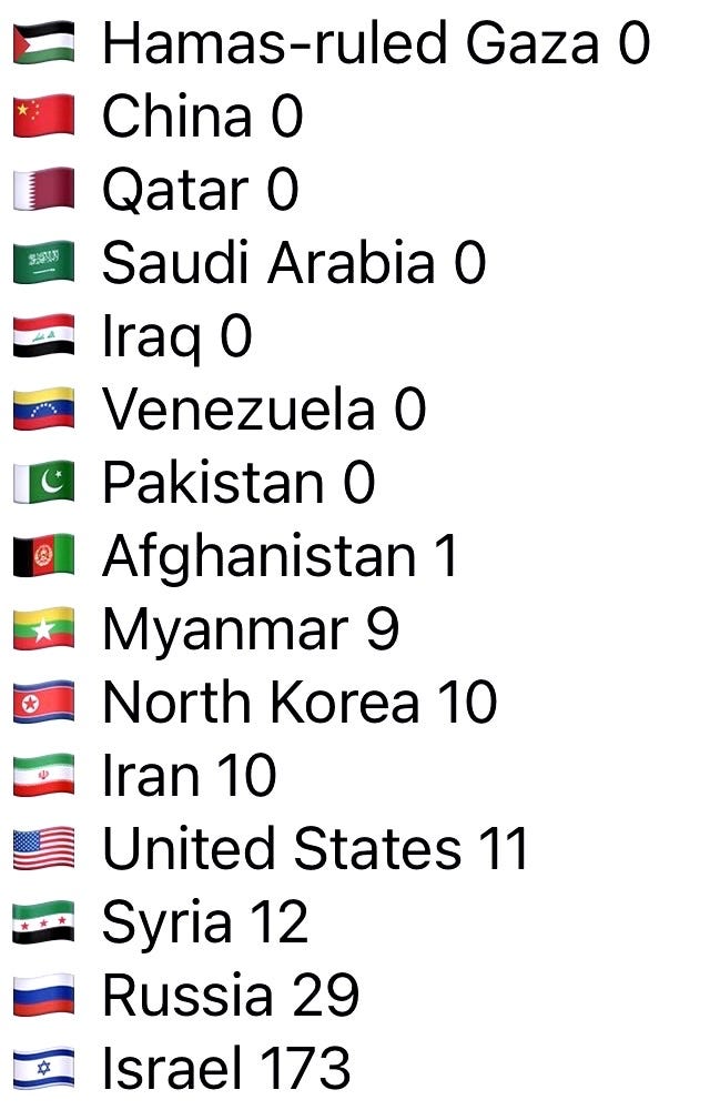 As it turns out, from 2015 to 2023, the UNGA adopted 154 resolutions against Israel compared to 71 for the rest of the world combined.1 And by 2025, Israel’s UNGA cumulative tally did in fact reach 173.2